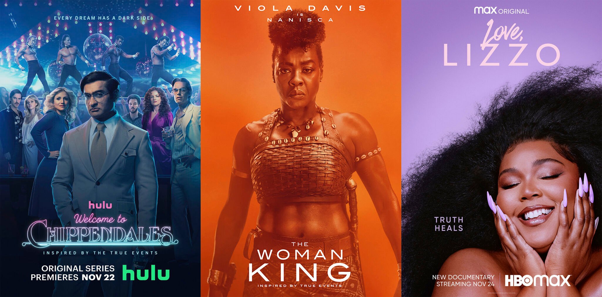 This combination of photos shows promotional art for "Welcome to Chippendales," a series premiering Nov 22, left, "The Woman King," available on VOD on Nov. 22, center, and "Love. Lizzo," a film premiering Nov. 24 on HBO Max. (Hulu/Sony Pictures/HBO Max via AP)