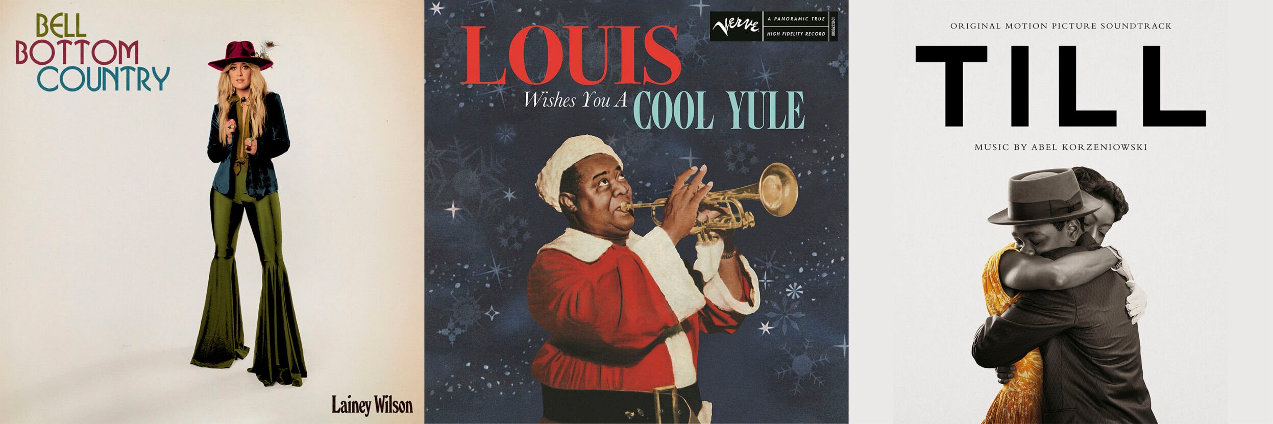 This combination of photos show album art for “Bell Bottom Country” by Lainey Wilson, left, “Louis Wishes You a Cool Yule,” a Louis Armstrong Christmas album, center, and the soundtrack from the film "Till." (BBR Music Group/Verve/Ume/Mercury Classics via AP)