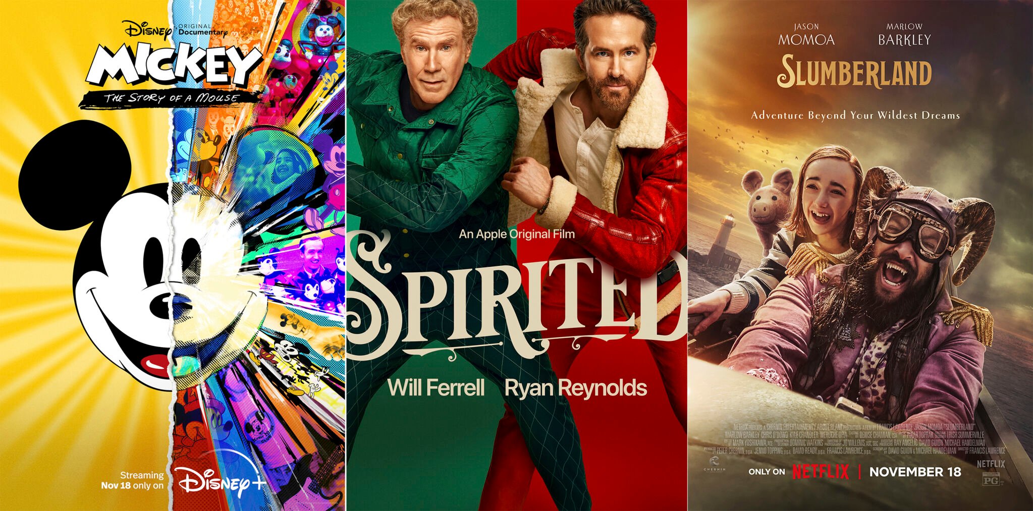This combination of photos show promotional art for the documentary treatment “Mickey: The Story of a Mouse,” debuting Nov. 18, on Disney+, left, the holiday comedy “Spirited,” a riff on “A Christmas Carol” starring Will Ferrell and Ryan Reynolds, debuting Nov. 18, on Apple TV+., center, and the fantasy adventure film “Slumberland,” debuting Nov. 18 on Netflix. (Disney+/Apple TV+/Netflix via AP)