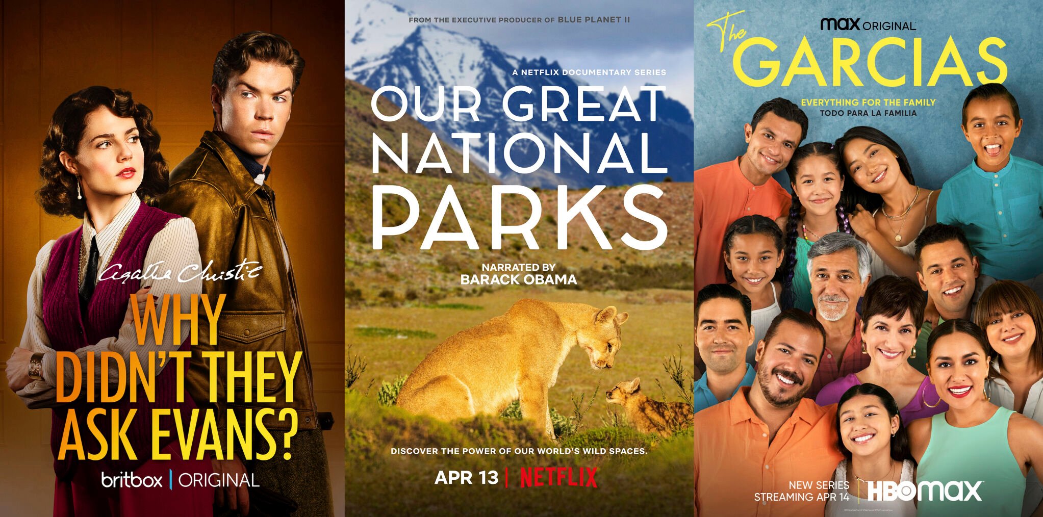 This combination of images shows promotional art for “Why Didn't They Ask Evans?” debuting April 12 on BritBox, “Our Great National Parks,” a five-part Netflix series premiering April 13 and "The Garcias," debuting April 14 on HBO Max. (BritBox/Netflix/HBO Max via AP)