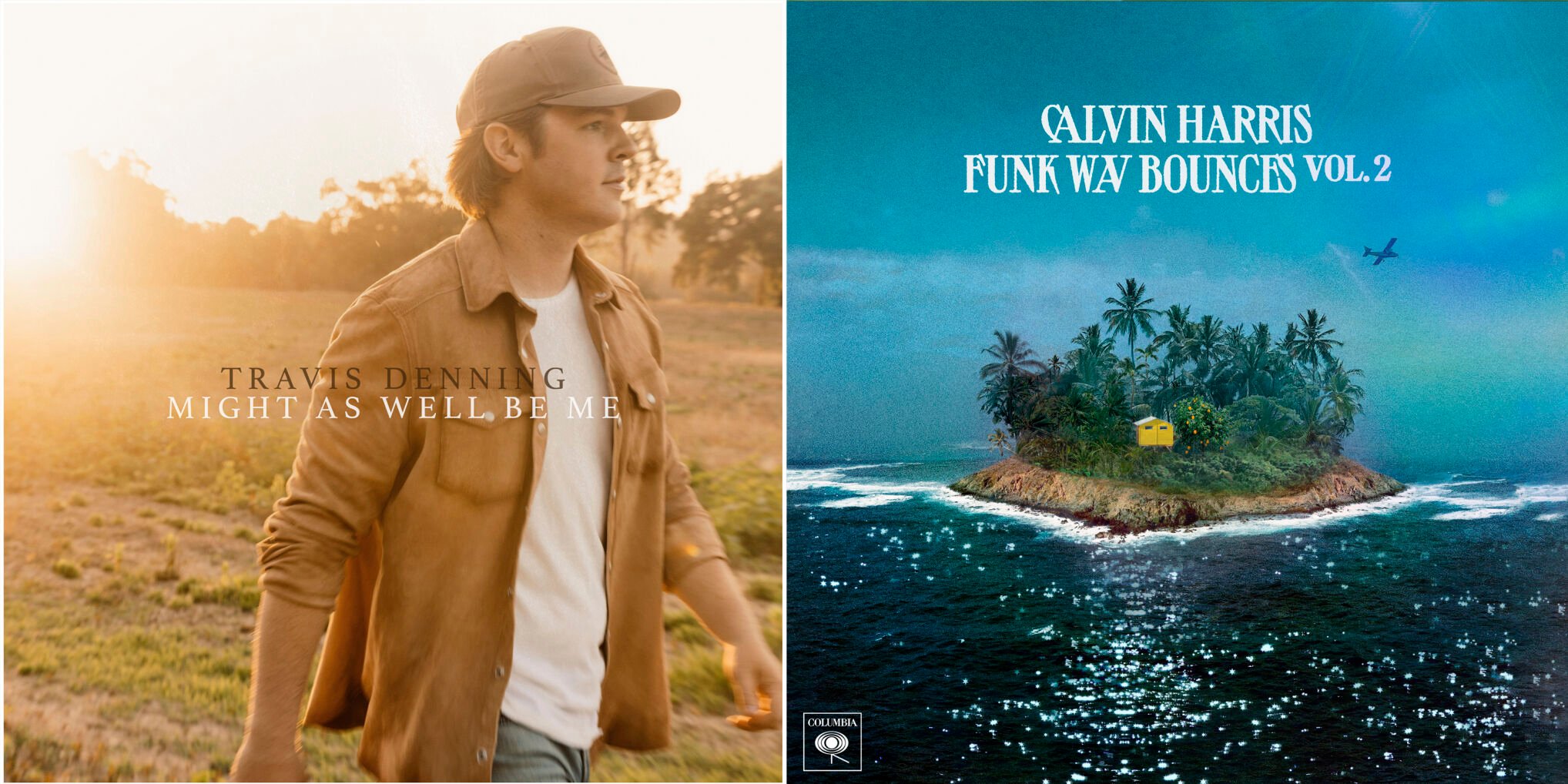 This combination of images shows album art for Travis Denning's new six-song EP, "Might As Well Be Me" left, and Calvin Harris' new album "Funk Wav Bounces Vol. 2." (Mercury Nashville/Columbia Records via AP)