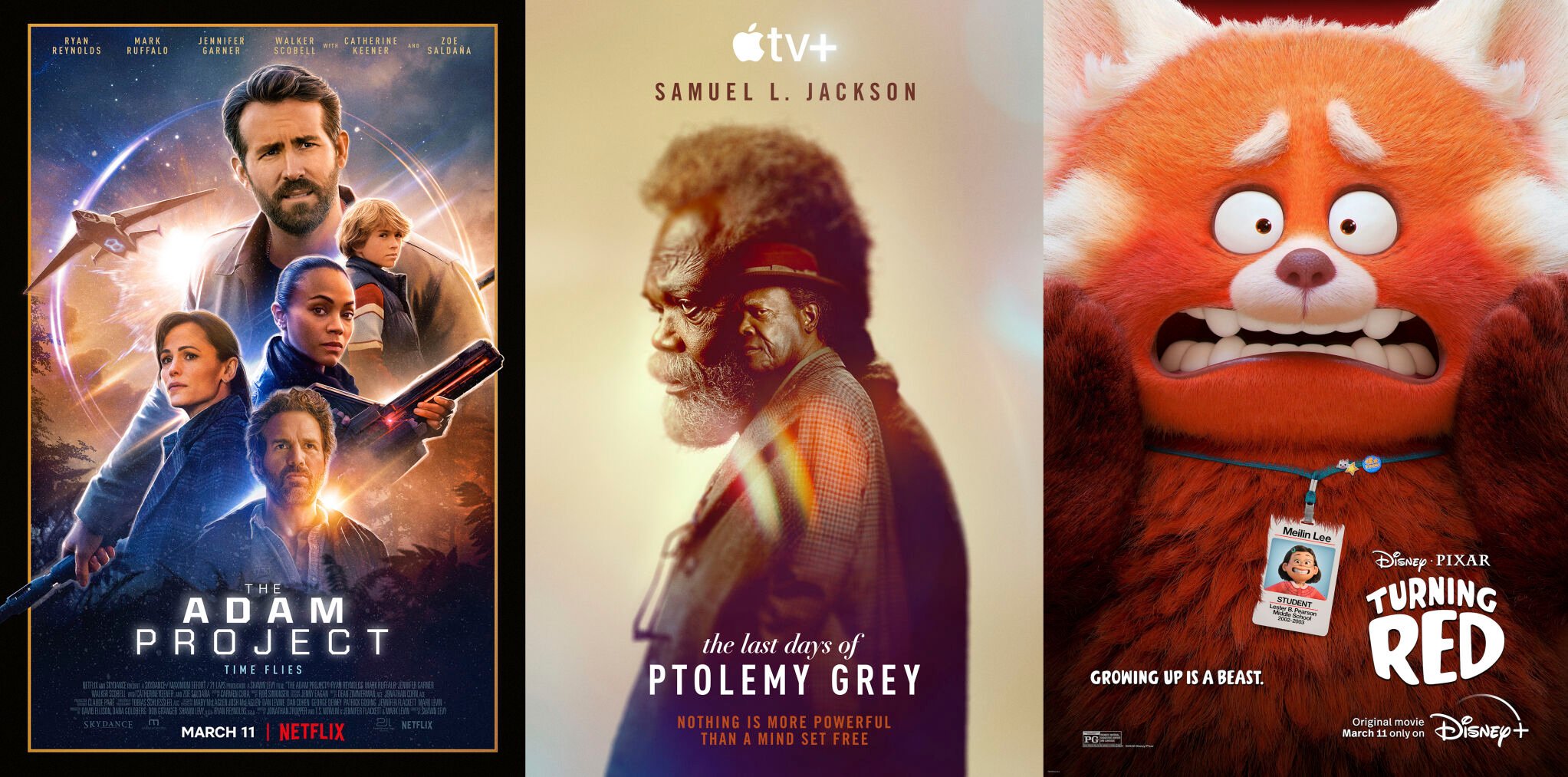 This combination of photos shows promotional imagery for "The Adam Project," a Netflix film premiering March 11, "The Last Days of Ptolemy Grey," a series premiering March 11 on Apple TV+ and "Turning Red," an animated film premiering March 11 on Disney+. (Netflix/Apple TV+/ Disney+ via AP)