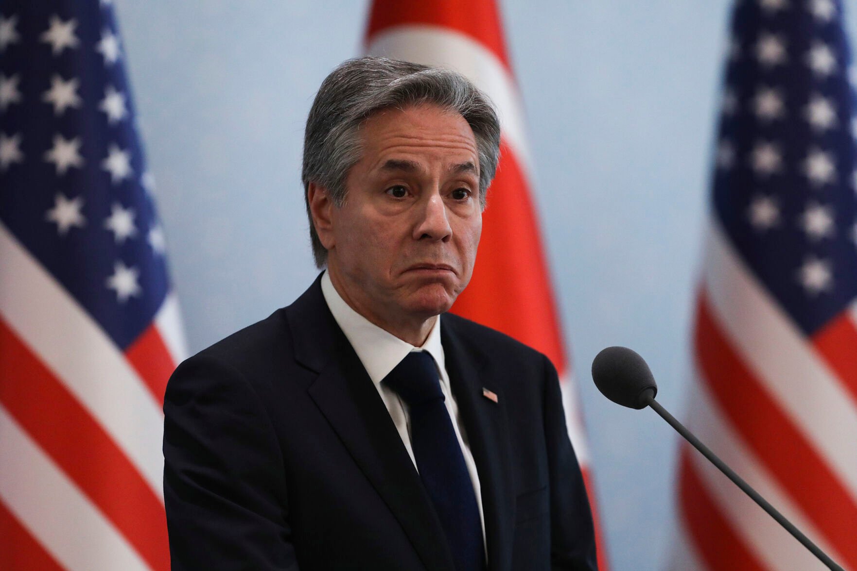 U.S. Secretary of State Antony Blinken talks to journalists Monday during a joint news conference with Turkish Foreign Minister Mevlut Cavusoglu in Ankara, Turkey.