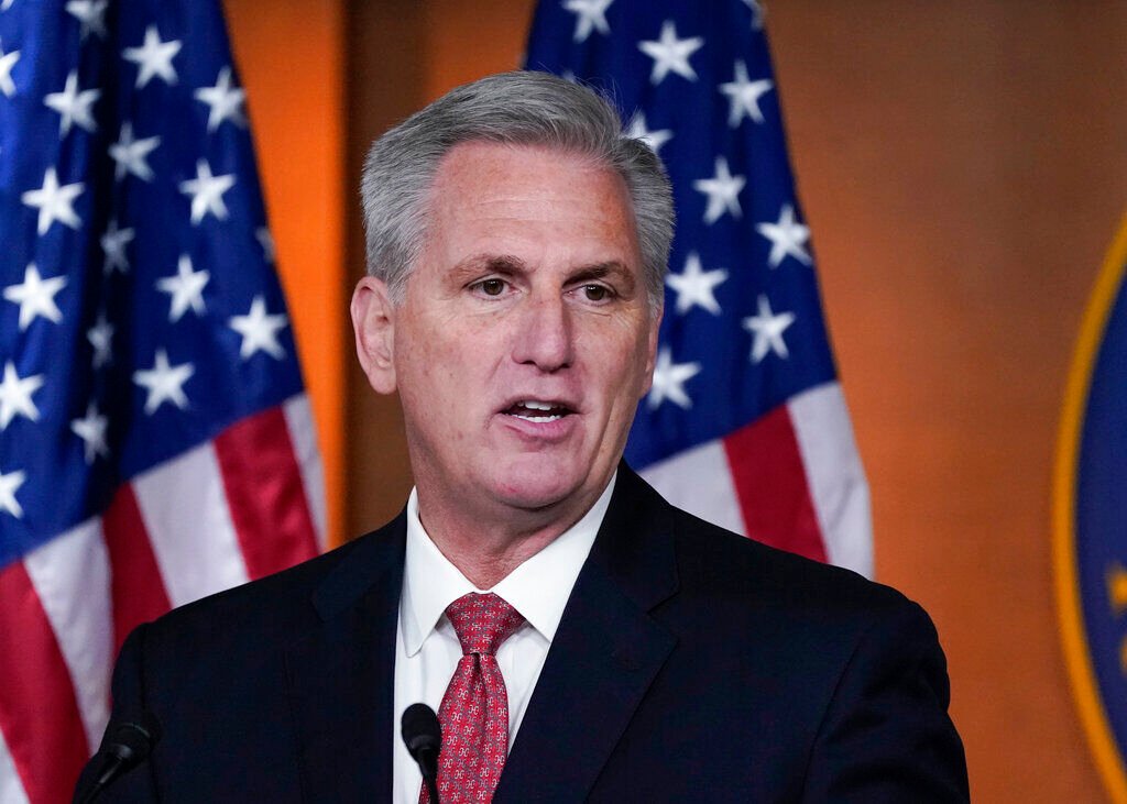 FILE - House Minority Leader Kevin McCarthy, R-Calif., responds to reporters at the Capitol in Washington, Dec. 3, 2021, about the behavior of Rep. Lauren Boebert, R-Colo.Â