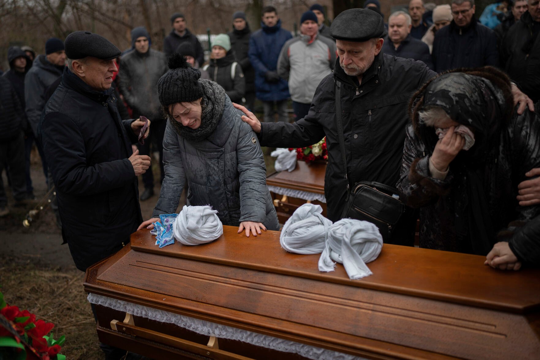 Relatives of Maksym and Nataliia Shvets, a couple who died under the rubble after Russia hit their apartment block with a missile, cry near one of the coffins during a funeral service Wednesday in Dnipro, Ukraine.