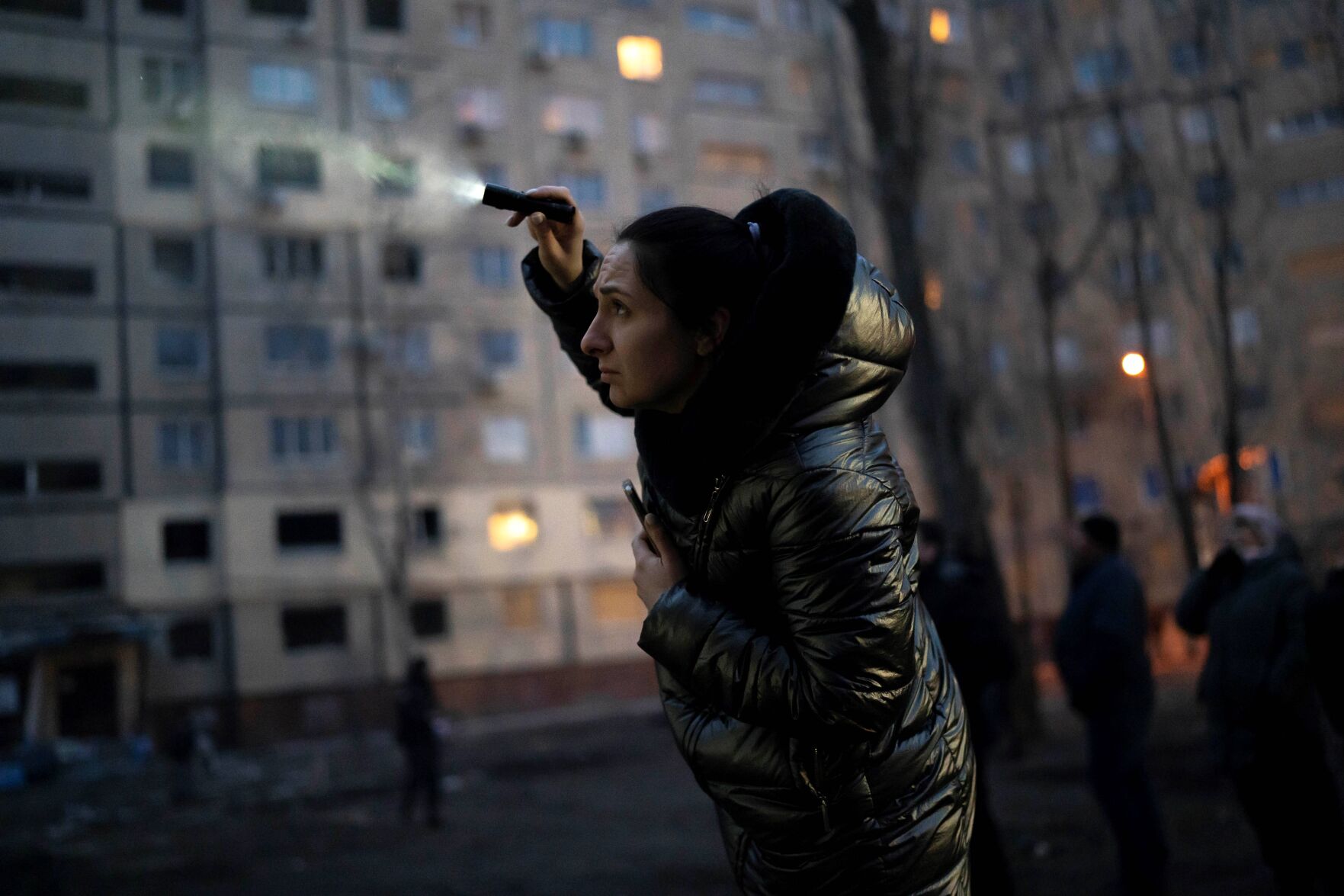 Nadiia Yaroshenko, 38, uses a torch to look for her cat that was trapped in a damaged building Tuesday in Dnipro, Ukraine