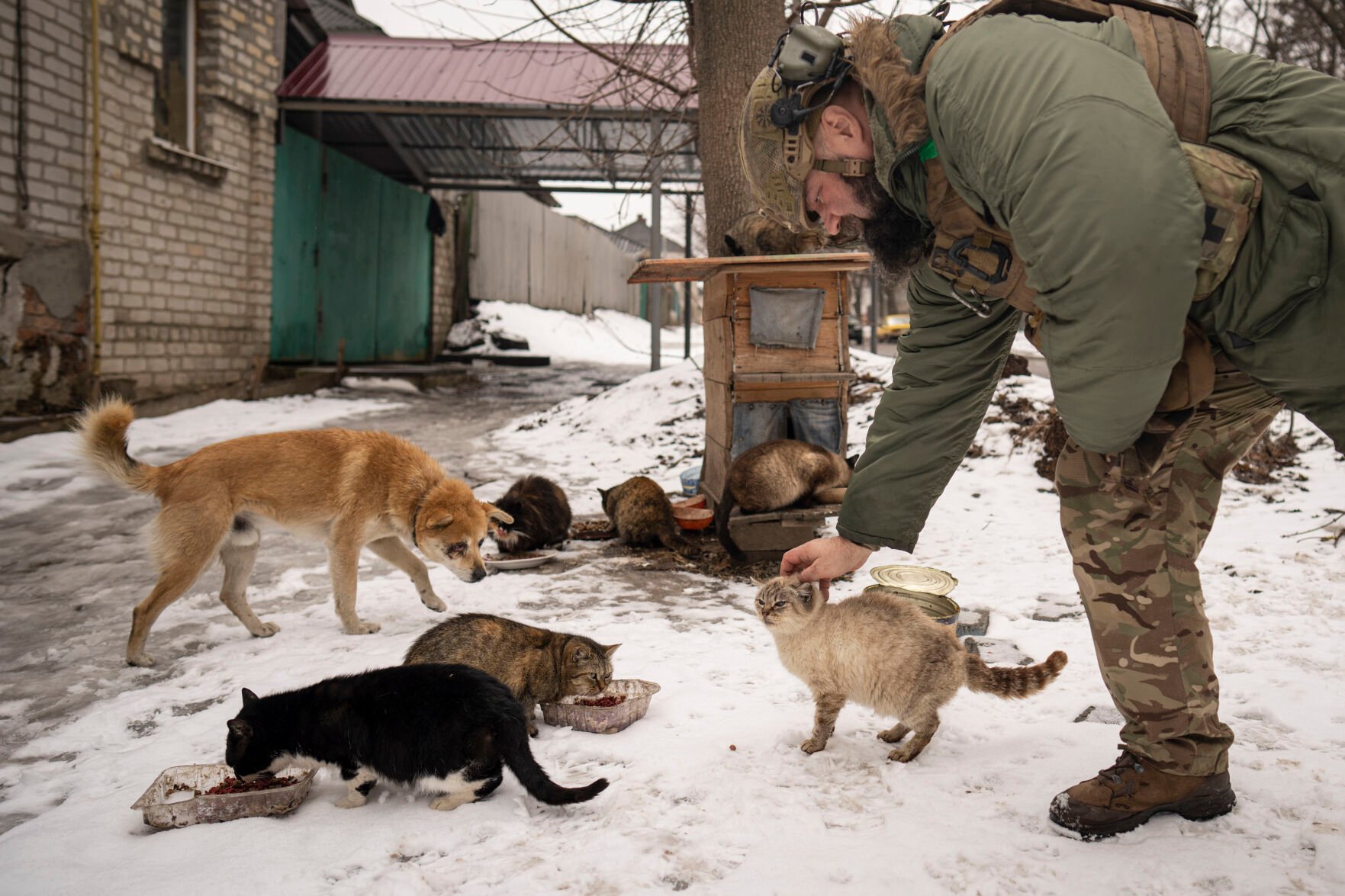 A Ukrainian service member feeds stray cats Saturday next to a makeshift shelter they built for them in the Kharkiv area of Ukraine.