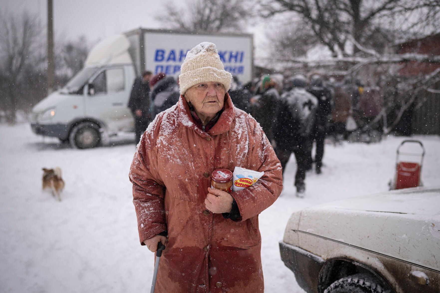 In the village of Zelena, dozens of older residents waited under a bus shelter amid heavy snows for a food truck to arrive.