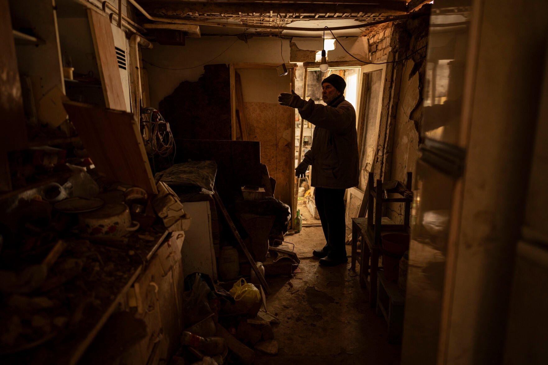 Oleksandr Luzhan gestures inside his mother's damaged home Feb. 20 in Kupiansk, Ukraine.