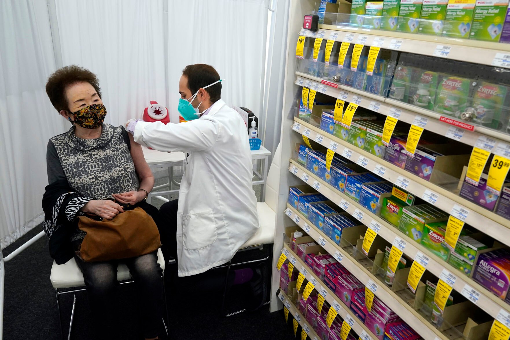 FILE - Pharmacist Todd Gharibian, right, administers a dose of the Moderna COVID-19 vaccine to Toshiko Sugiyama, left, at a CVS Pharmacy branch on March 1, 2021, in Los Angeles. A rush of vaccine-seeking customers and staff shortages are squeezing drugstores around the country. That has led to frazzled workers and even temporary pharmacy closures. (AP Photo/Marcio Jose Sanchez, File)