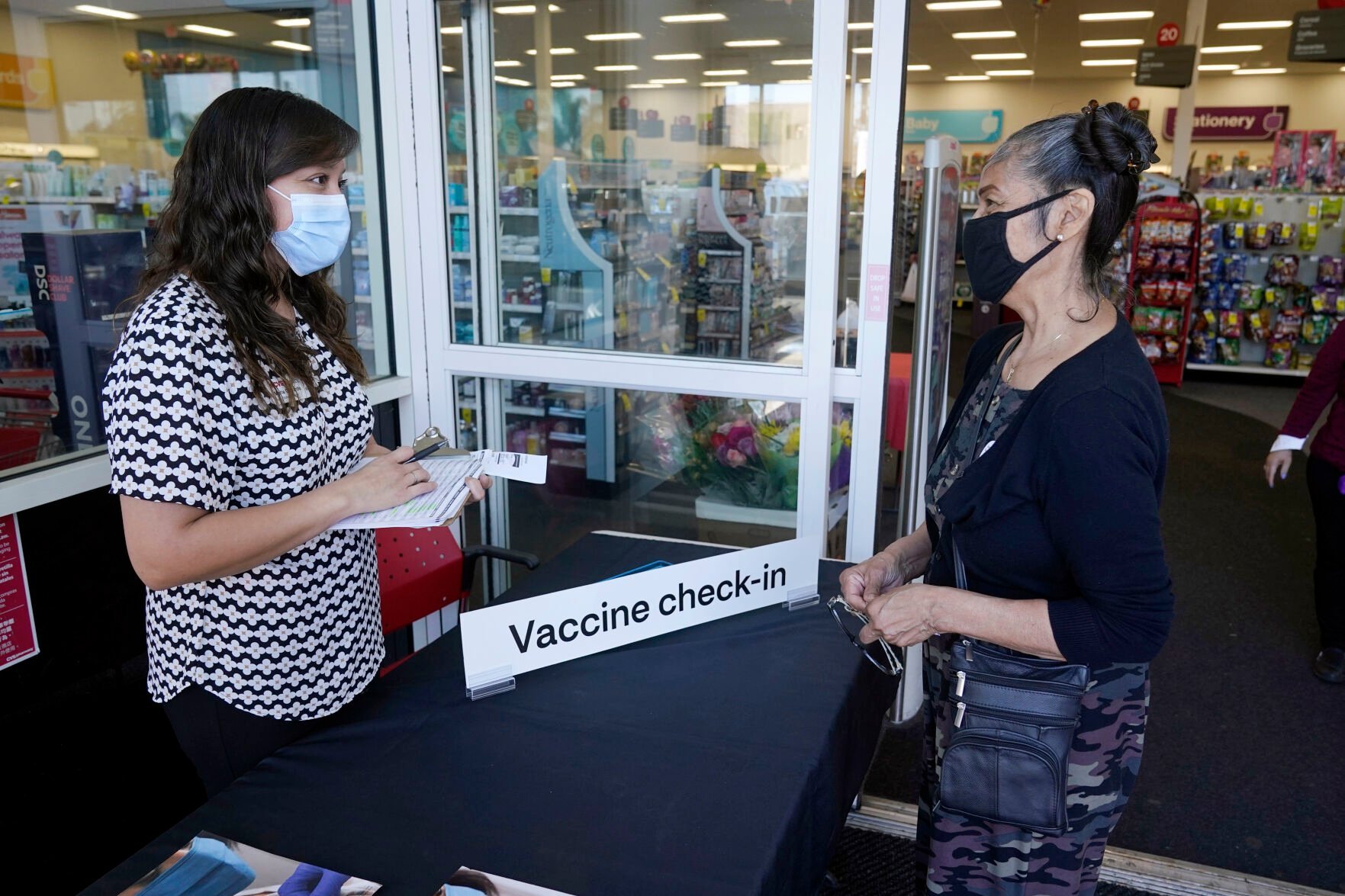 FILE - Belinda Perez, left, checks in with store manager Maria Gallardo at a COVID-19 vaccination site inside a CVS Pharmacy branch on March 1, 2021, in Los Angeles. A rush of vaccine-seeking customers and staff shortages are squeezing drugstores around the country. That has led to frazzled workers and even temporary pharmacy closures. (AP Photo/Marcio Jose Sanchez, File)