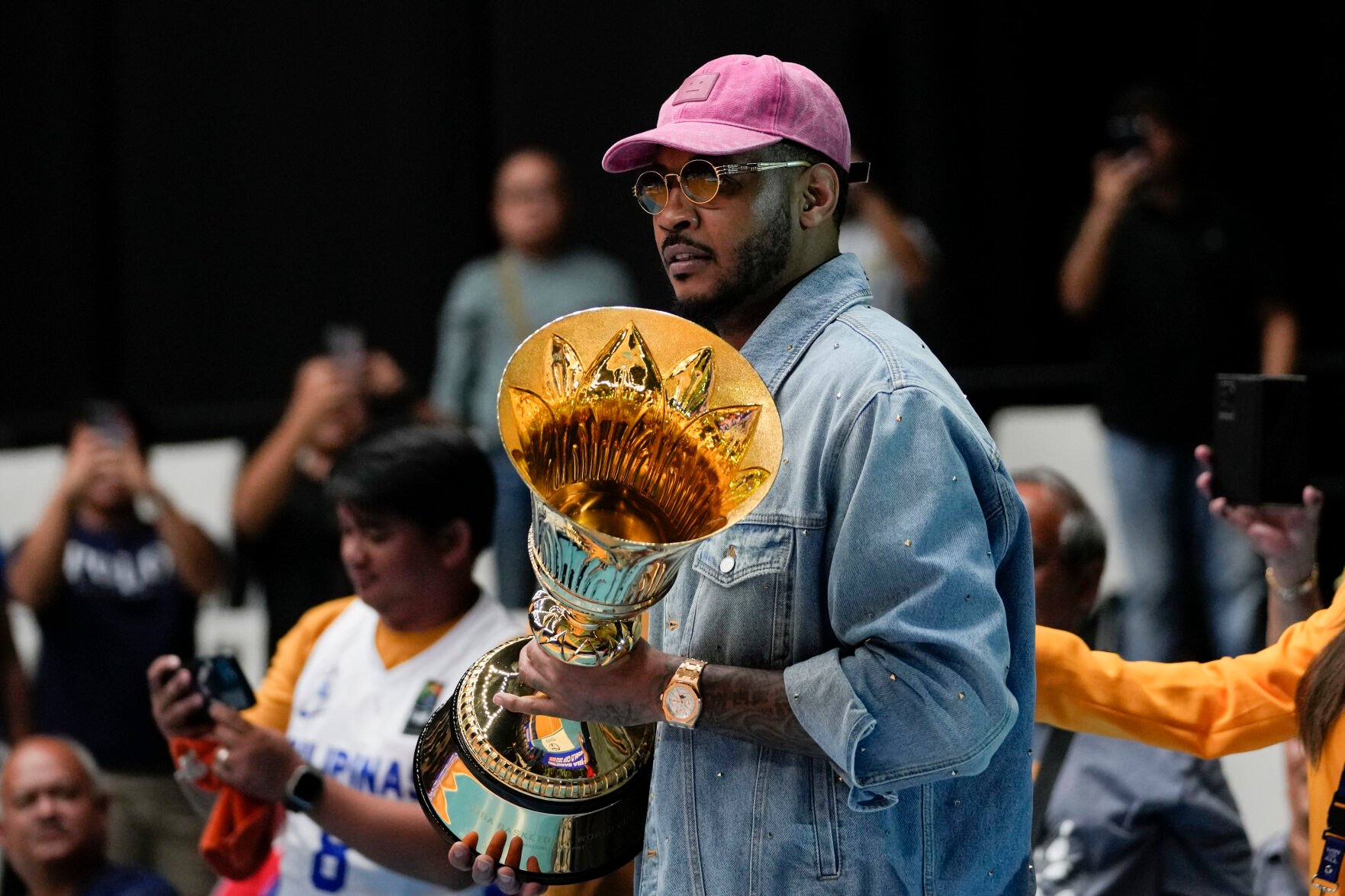 <p>FIBA Global Ambassador Carmelo Anthony carries a trophy before the games against Philippines and Lebanon at the FIBA Basketball World Cup 2023 Asian Qualifiers on Friday.</p>