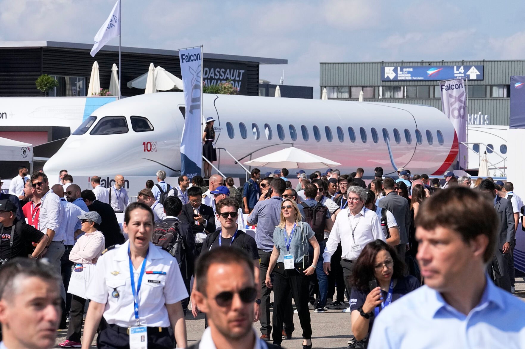 FILE - Visitors walk by a Falcon 10X prototype by the French manufacturer Dassault Aviation, at the Paris Air Show, Wednesday, June 21, 2023 in Le Bourget, north of Paris. Airlines are facing increasing pressure to cut their climate-changing emissions. That made sustainable aviation fuel a hot topic this week at the Paris Air Show, a major industry event. Sustainable fuel made from food waste or plant material is aviation's best hope for reducing emissions in the next couple of decades.