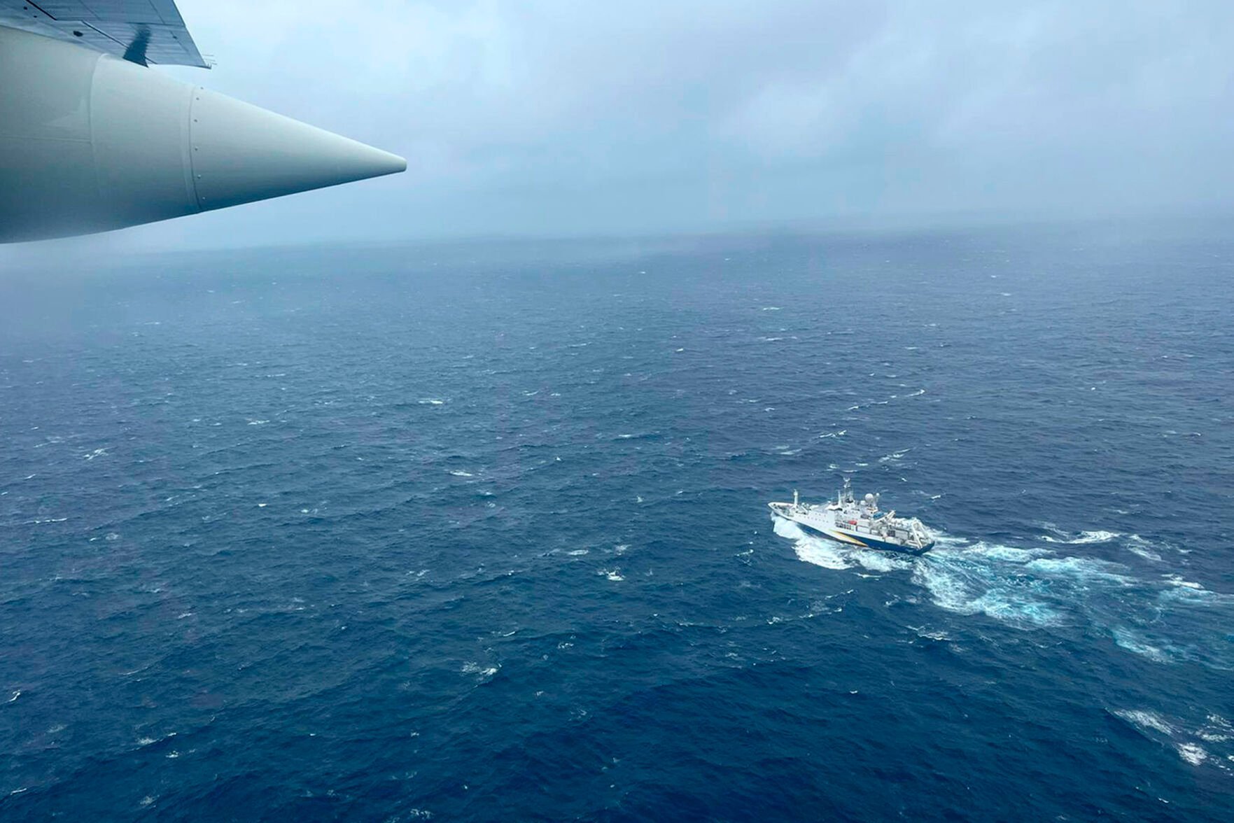 A Coast Guard HC-130 Hercules airplane based at Coast Guard Air Station Elizabeth City, N.C., flies over the French research vessel, L'Atalante approximately 900 miles East of Cape Cod, Mass., during the search for the 21-foot submersible Titan on June 21.