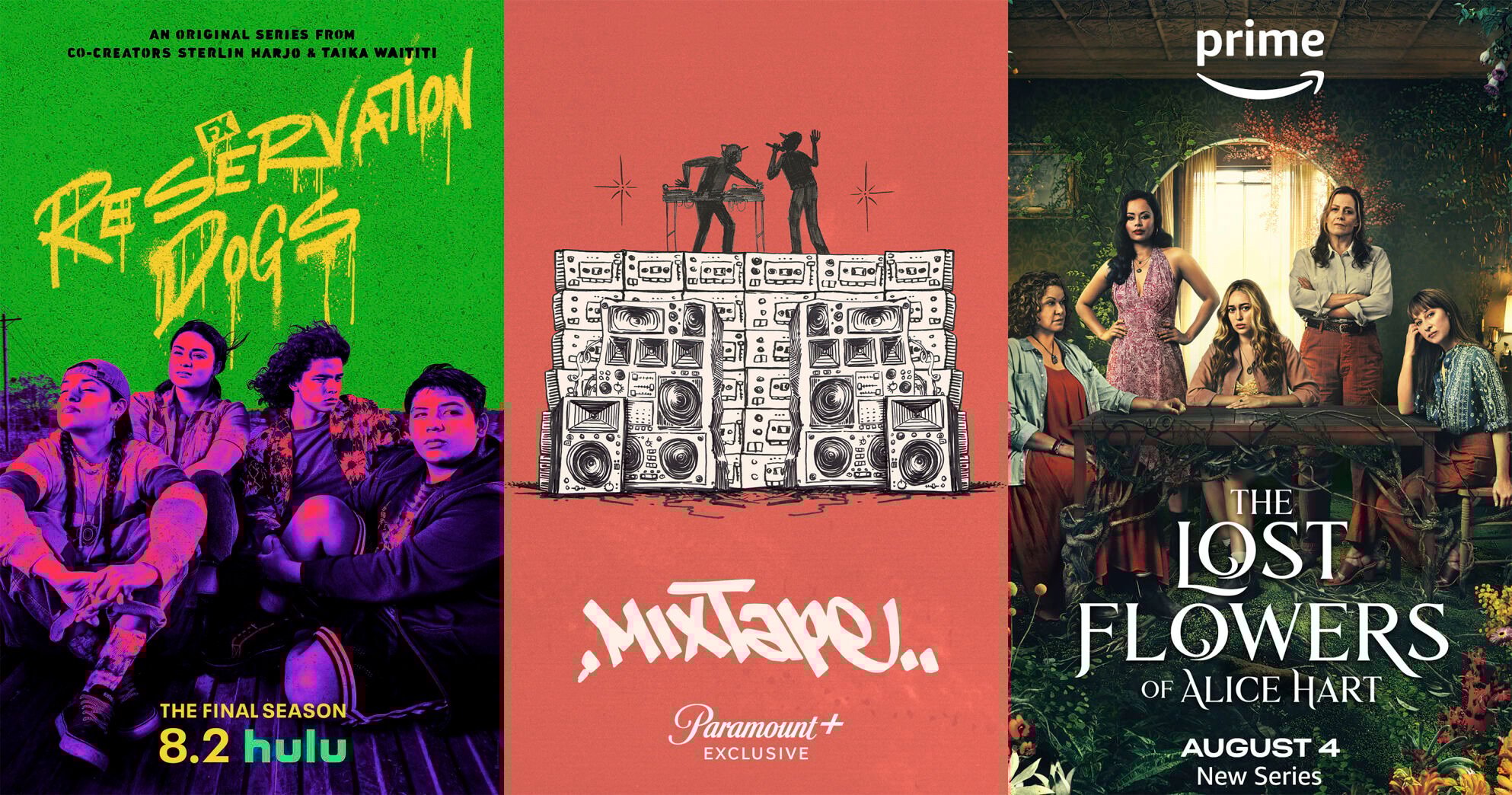 This combination of images shows promotional art for "Reservation Dogs," left, "Mixtape" and "The Lost Flowers of Alice Hart." (Hulu/Paramount+/Prime Video via AP)