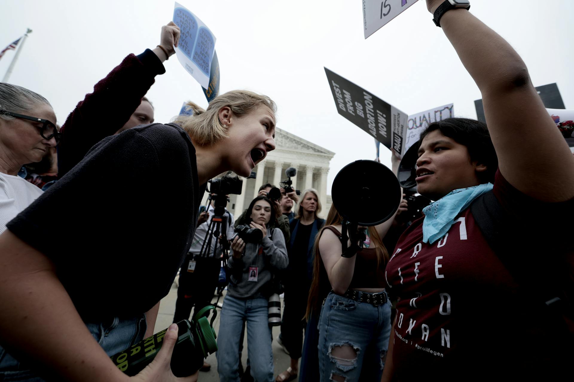 Activists who oppose and support abortion rights clash outside the U.S. Supreme Court building. Anna Moneymaker/Getty Images