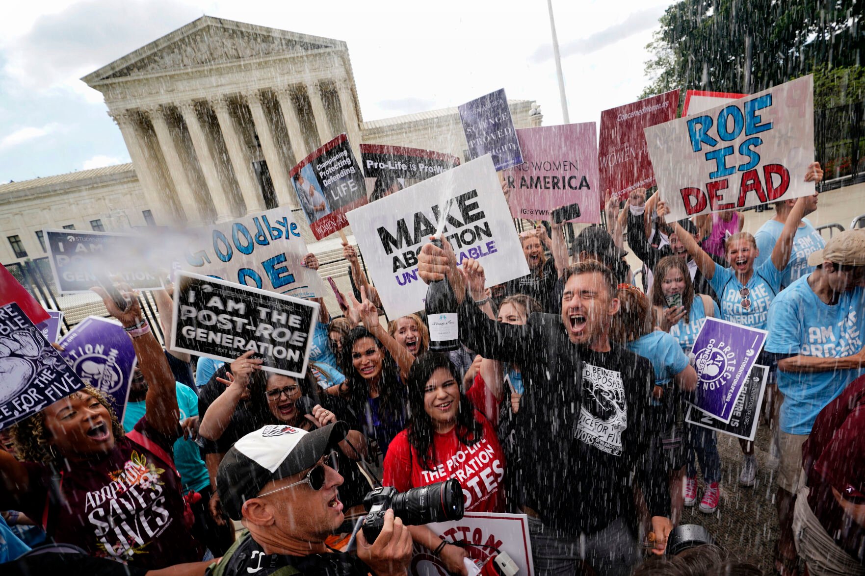 Anti-abortion advocates celebrate outside the Supreme Court in Washington on June 24, 2022, following the court's decision to end constitutional protections for abortion that had been in place nearly 50 years. One year ago, the U.S. Supreme Court rescinded a five-decade-old right to abortion, prompting a seismic shift in debates about politics, values, freedom and fairness. (AP Photo/Steve Helber)