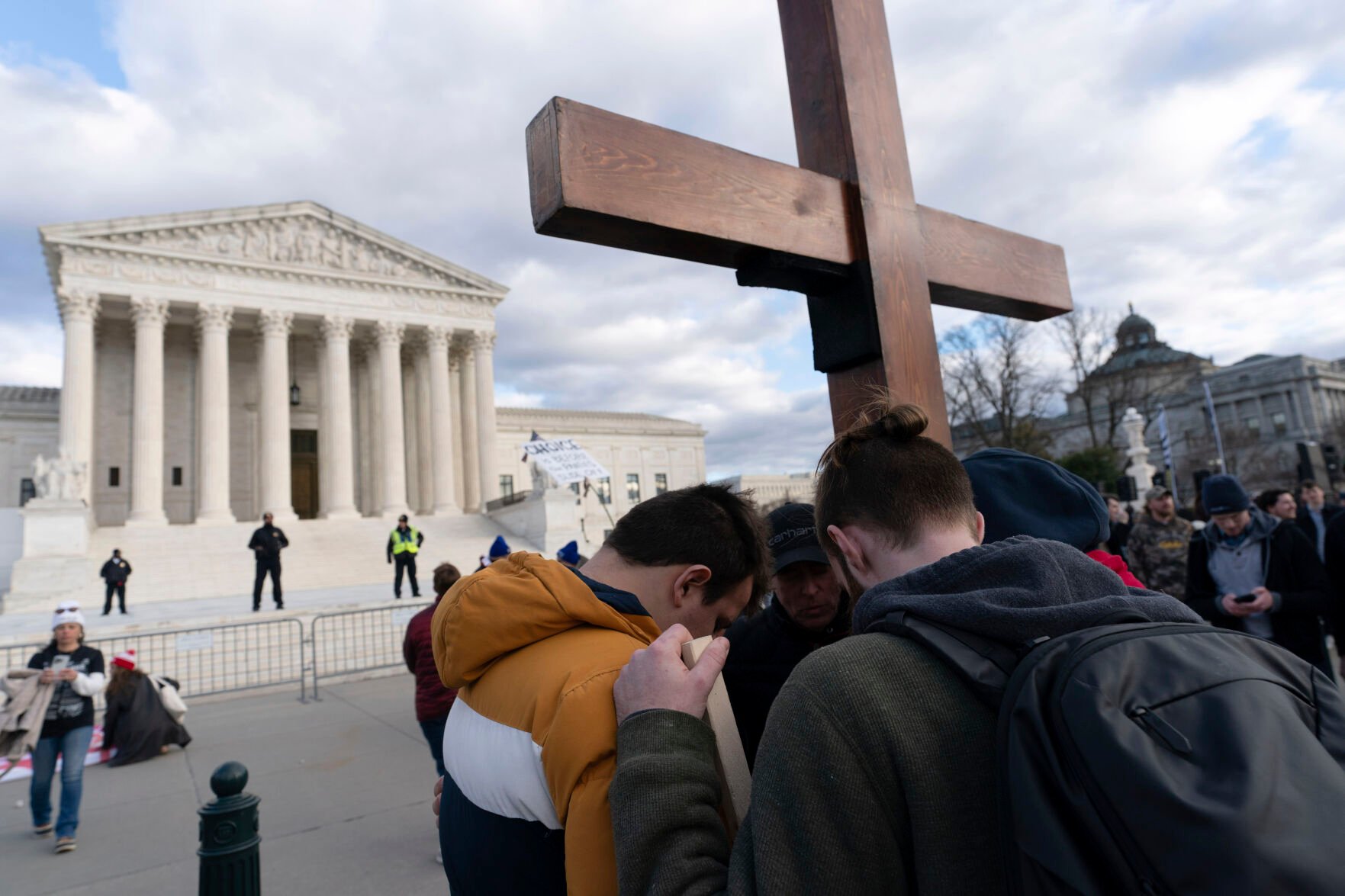 FILE - Anti-abortion activists have a pray as they rally outside of the U.S. Supreme Court during the March for Life in Washington, Friday, Jan. 20, 2023. One year ago, the U.S. Supreme Court rescinded a five-decade-old right to abortion, prompting a seismic shift in debates about politics, values, freedom and fairness. (AP Photo/Jose Luis Magana, File)