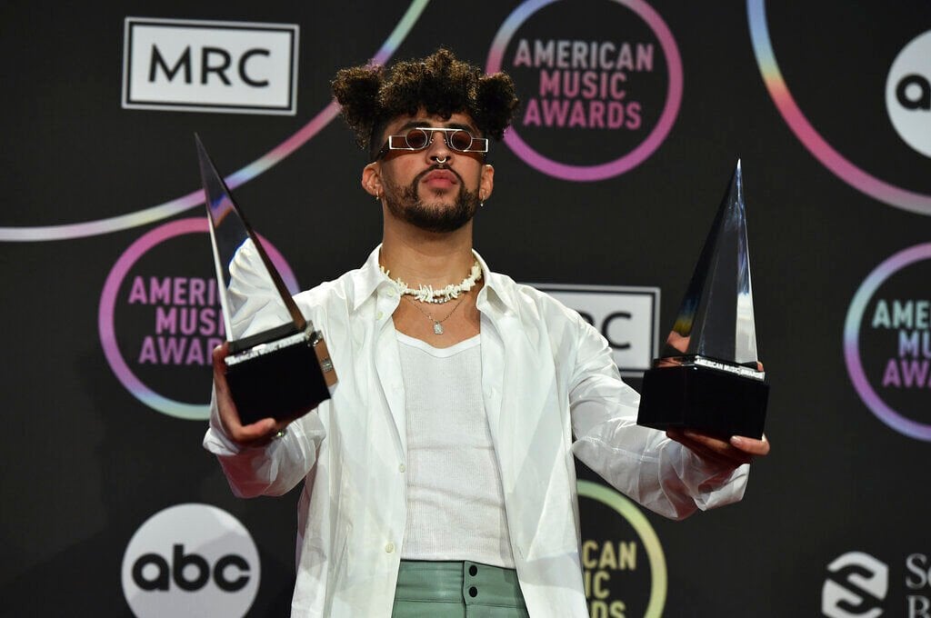Chris PizzelloBad Bunny accepts the award for favorite latin album for "El Ultimo Tour Del Mundo" at the American Music Awards on Sunday, Nov. 21, 2021 at Microsoft Theater in Los Angeles. (AP Photo/Chris Pizzello)
