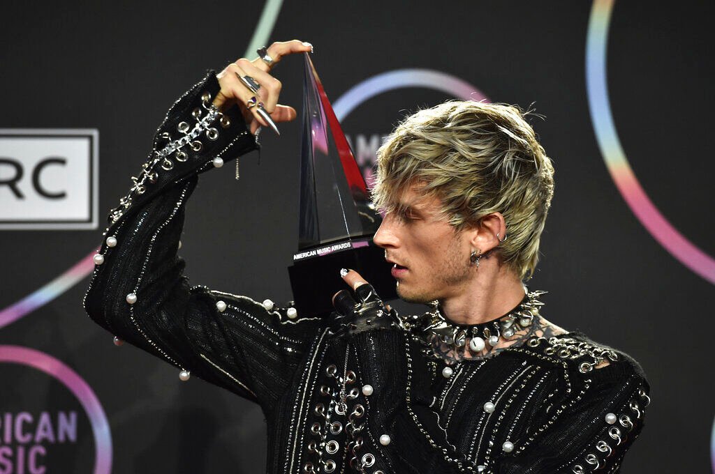 Machine Gun Kelly accepts the award for favorite rock artist at the American Music Awards on Sunday, Nov. 21, 2021 at Microsoft Theater in Los Angeles. (AP Photo/Chris Pizzello)