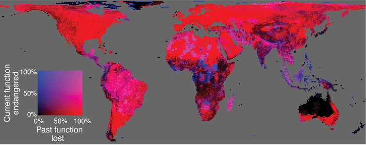 <p>Areas with brighter red coloration have lost more climate-tracking seed dispersal function. Areas with brighter blue coloration stand to lose more of their remaining seed dispersal function if endangered species there go extinct. <a class="source" href="https://www.science.org/doi/10.1126/science.abk3510">Fricke et al., 2022</a>, <a class="license" href="http://creativecommons.org/licenses/by-nd/4.0/">CC BY-ND</a></p>